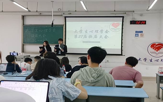年5月22日下午三点,西南交通大学心理学会在x2416教室举办了心理学会换届大会。本次换届大会由活动部张毫军和宣传部张钦璿同学主持,活动部张博骞策划,出席本次大会的有心学第24届、25届主席团部分人员,第26届主席团全体人员和各部门参与竞选的干事。因疫情原因,学会其他干事无法到场,故该大会同时也通过线上方式进行直播。这次换届大会为我校心学补充了新生力量。