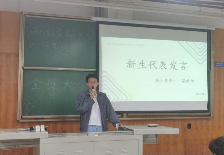 之后是梁皓阳同学作为新生代表上台发言。他幽默表示自己“对犯罪心理学感兴趣,但对犯罪不感兴趣”,引得同学们忍俊不禁,作为情景剧团部的部员,梁皓阳同学和众多成员一样,兴趣使然加入心理学会,在发言中,他表达了作为新成员的欣喜以及对后续社团生活的期待,新的篇章就此展开。