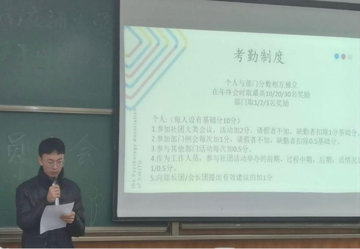 大会第三项是宣布新的社团章程。不以规矩不能成为方圆,大学生心理学会副会长林智杰同学宣读考勤等社团章程,规范新成员的行为举止,也为后续工作的顺利开展奠定基础。