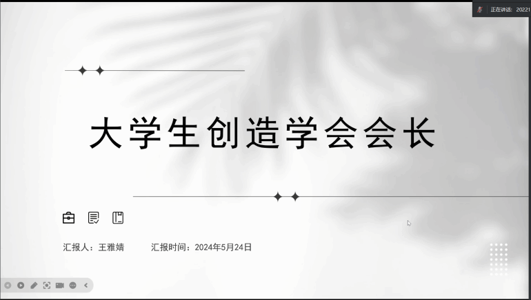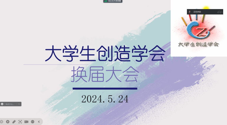 2024年5月24日晚9点,西南交通大学大学生创造学会举办本年度换届大会,大会由会长宫玉翠同学主持,社团指导老师蒋洪波老师出席本次大会。